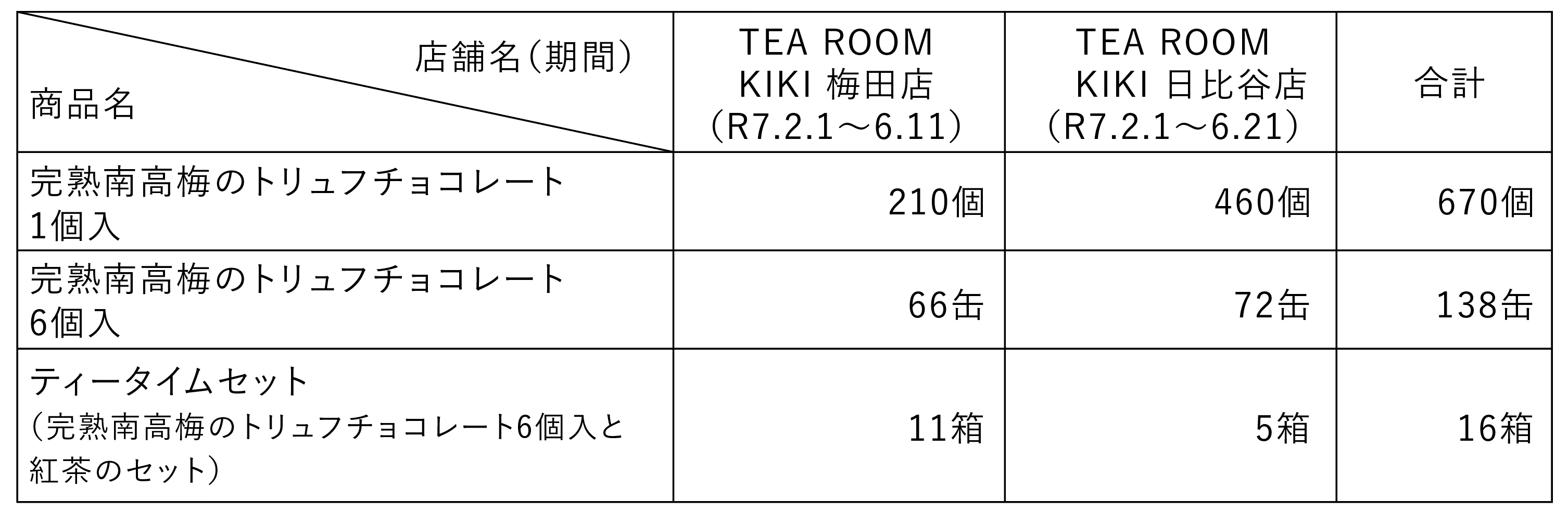 TEA ROOM KIKI梅田店(大阪府大阪市北区大深町4-20。)及びTEA ROOM KIKI日比谷店(東京都千代田区有楽町1-1-2。)において、販売した「完熟南高梅のトリュフチョコレート」について、原材料名を誤った表示で、また、原料原産地名「エクアドル産(カカオ豆)」を表示せず販売していましたので、お知らせします。