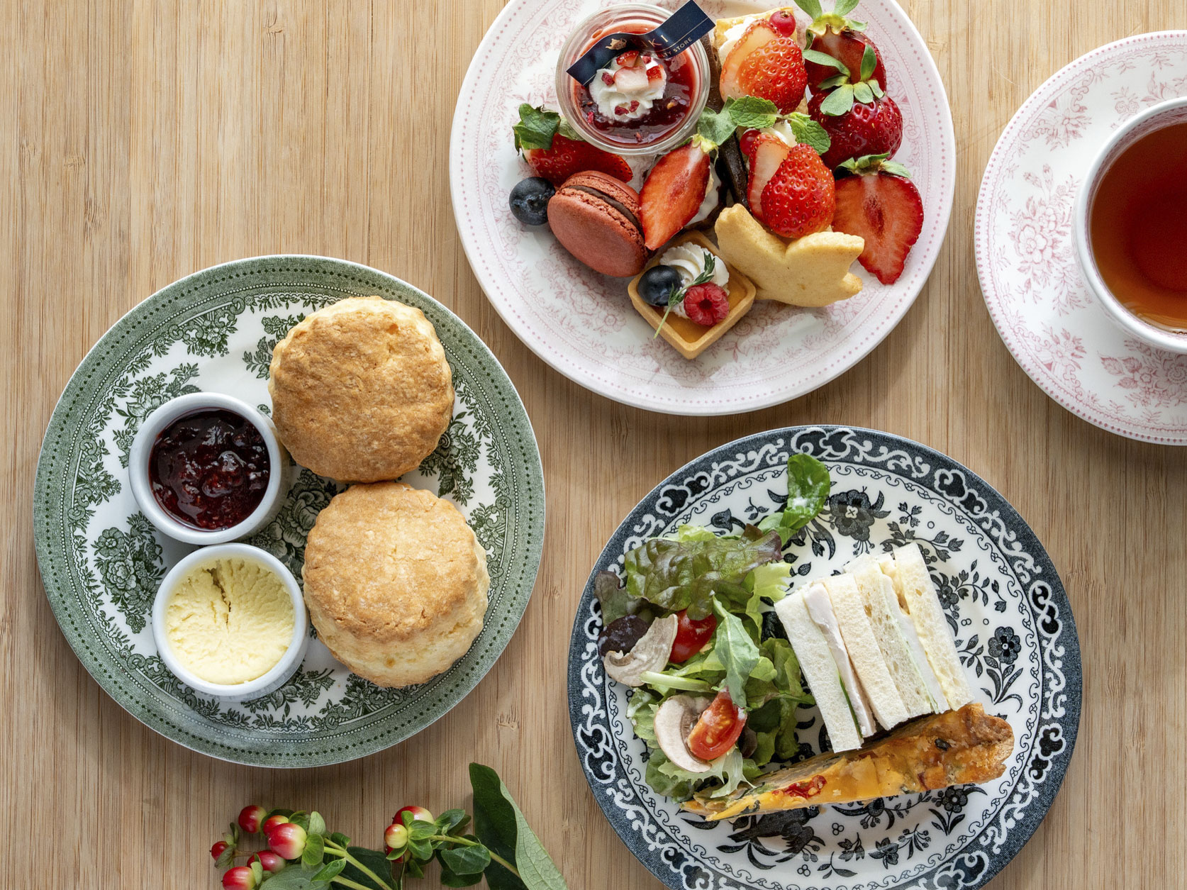 イギリス19世紀のデザイナー、ウィリアム・モリスは別荘の菜園から小鳥が苺を啄むのを見て代表作「いちご泥棒」の着想を得たといいます。KIKIのアフタヌーンティーシリーズ1番人気のこちらは、そんな彼の作品をモチーフにしています。今年も、和歌山県の契約農家「紀のファーム」のいちご「まりひめ」をスイーツにたっぷり使用しています。