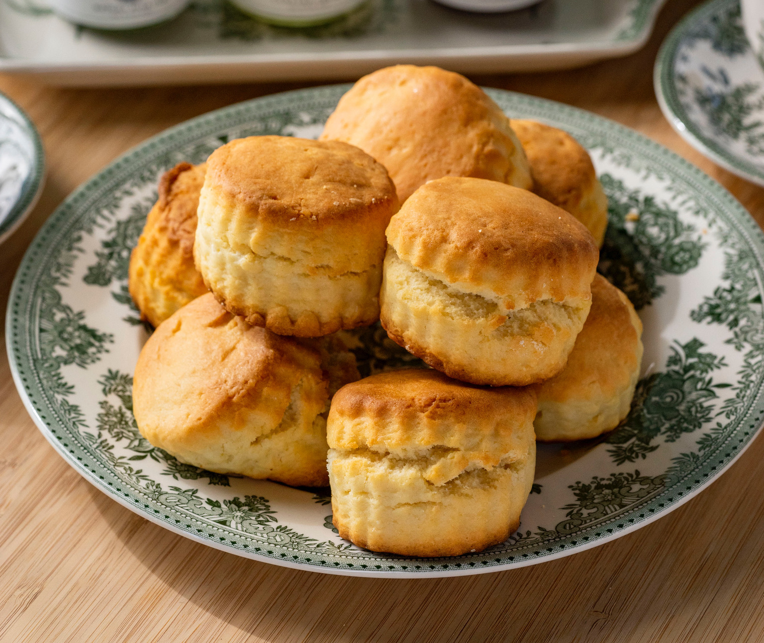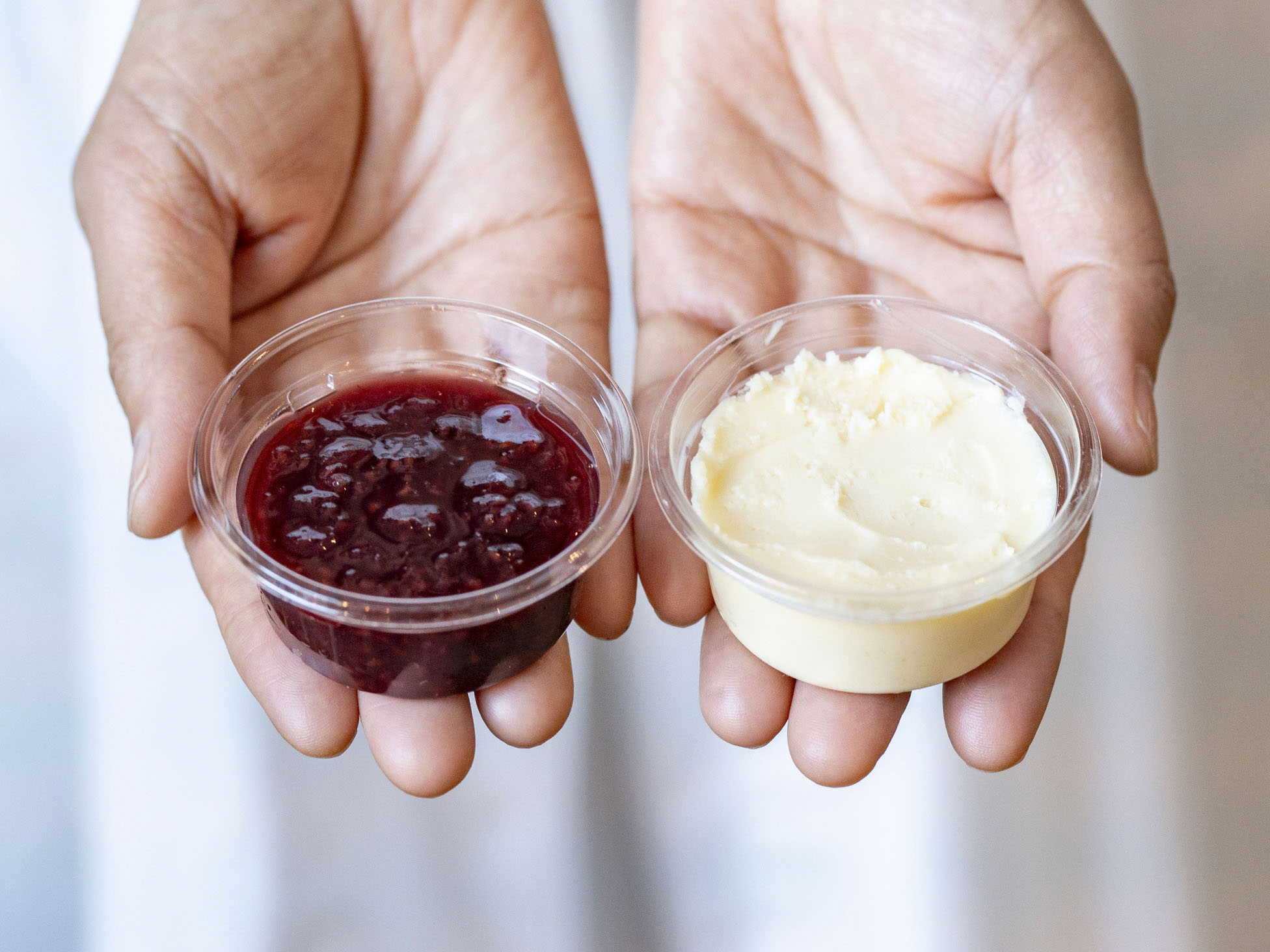 スコーンにはクロテッドクリームとジャムが欠かせません。スコーンを半分に割り、たっぷりと塗って英国の喫茶文化をご堪能ください。