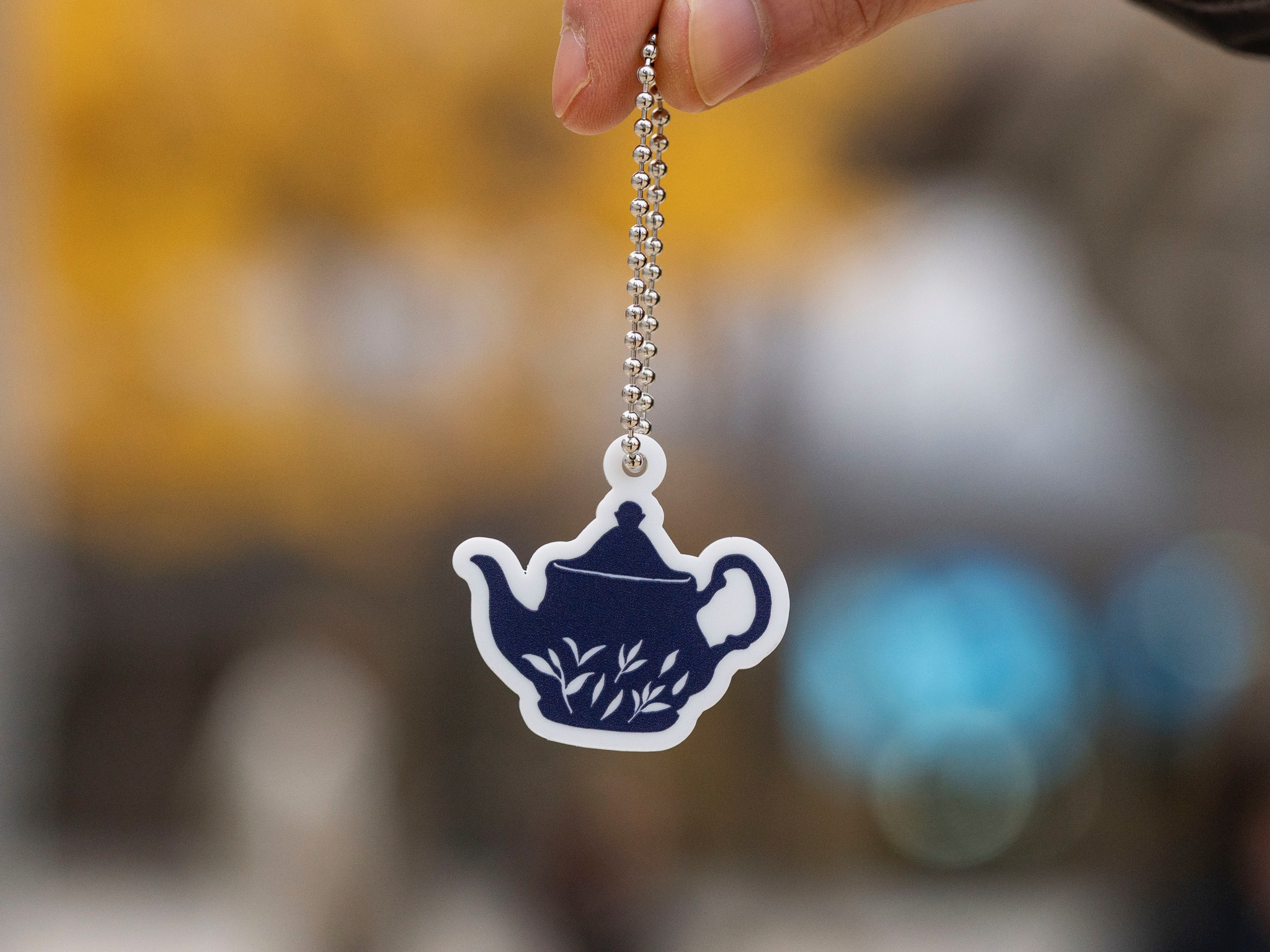 ホワイトのアクリルプレートに、紺色のティーポットロゴをレイアウト。落ち着いた色合いながらも軽やかで、鍵やポーチのアクセントにぴったりです。