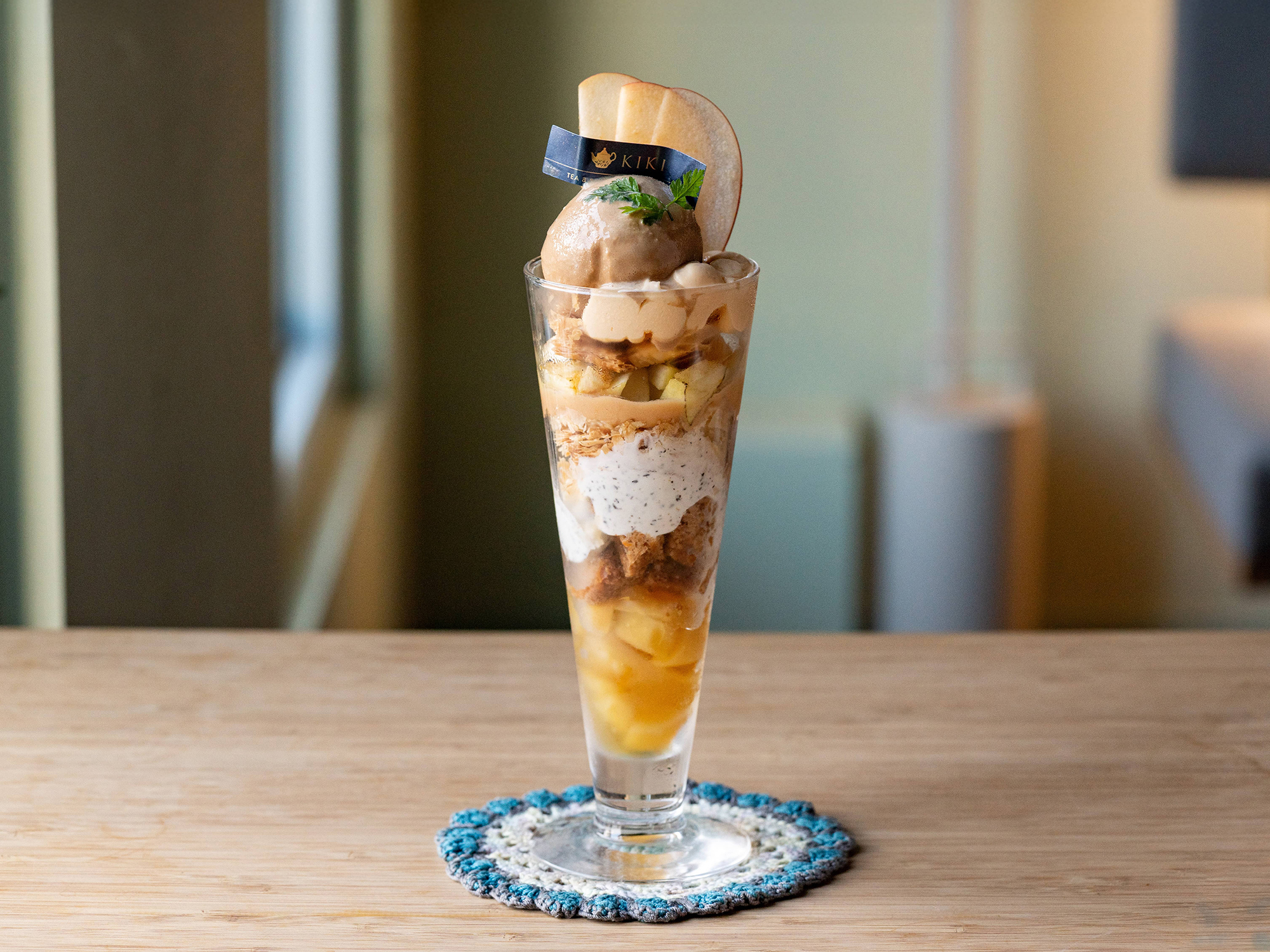 「木村りんご園」の旬のりんごをスライスやピューレでふんだんに使い自家製のカスタードやキャロットケーキと一緒に盛り付けた贅沢なパフェです。