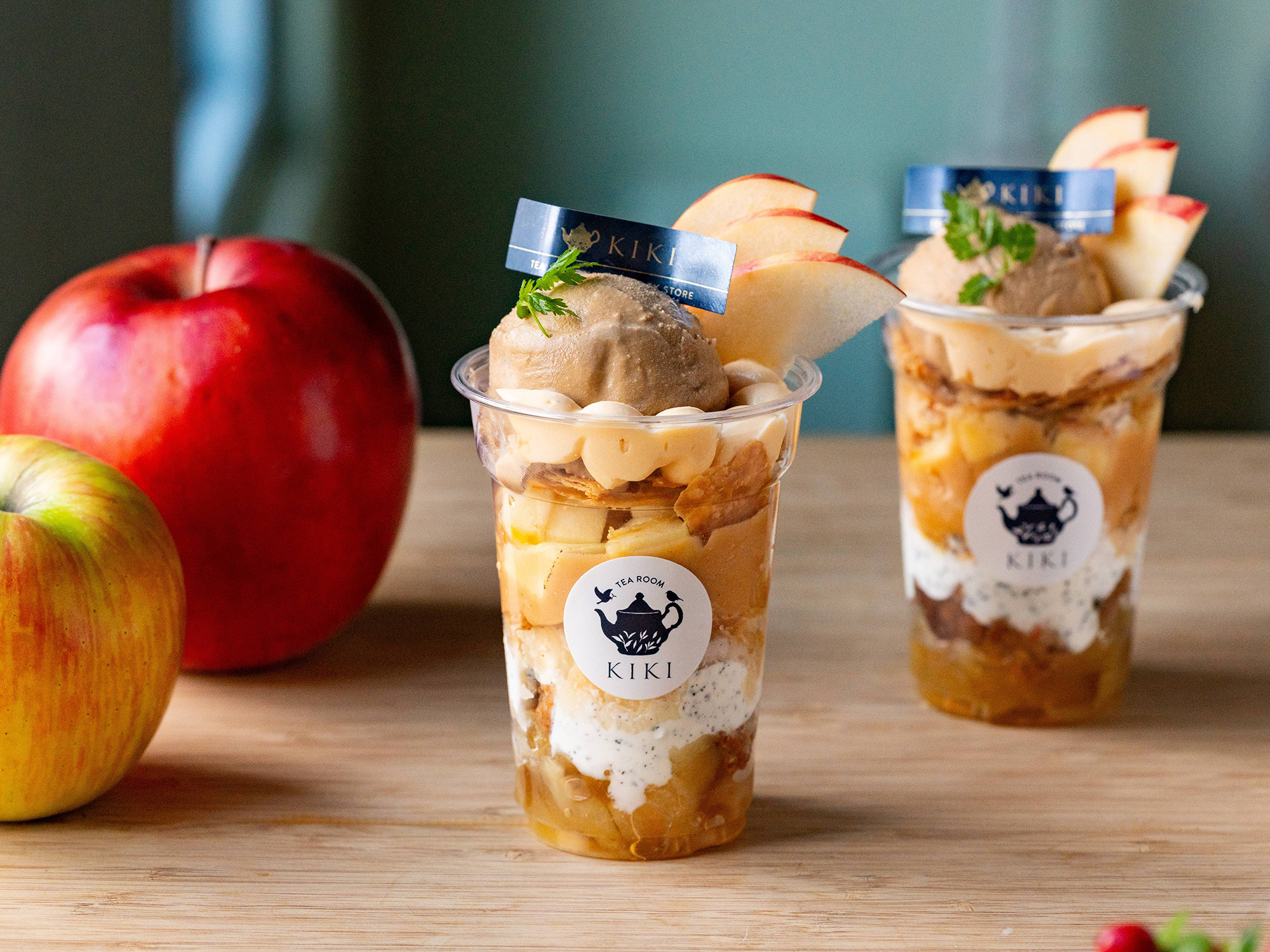 林檎のパフェは、テイクアウトでもお楽しみいただけます。食べ歩きや、公園、広場でゆったりとした時間をどうぞ。