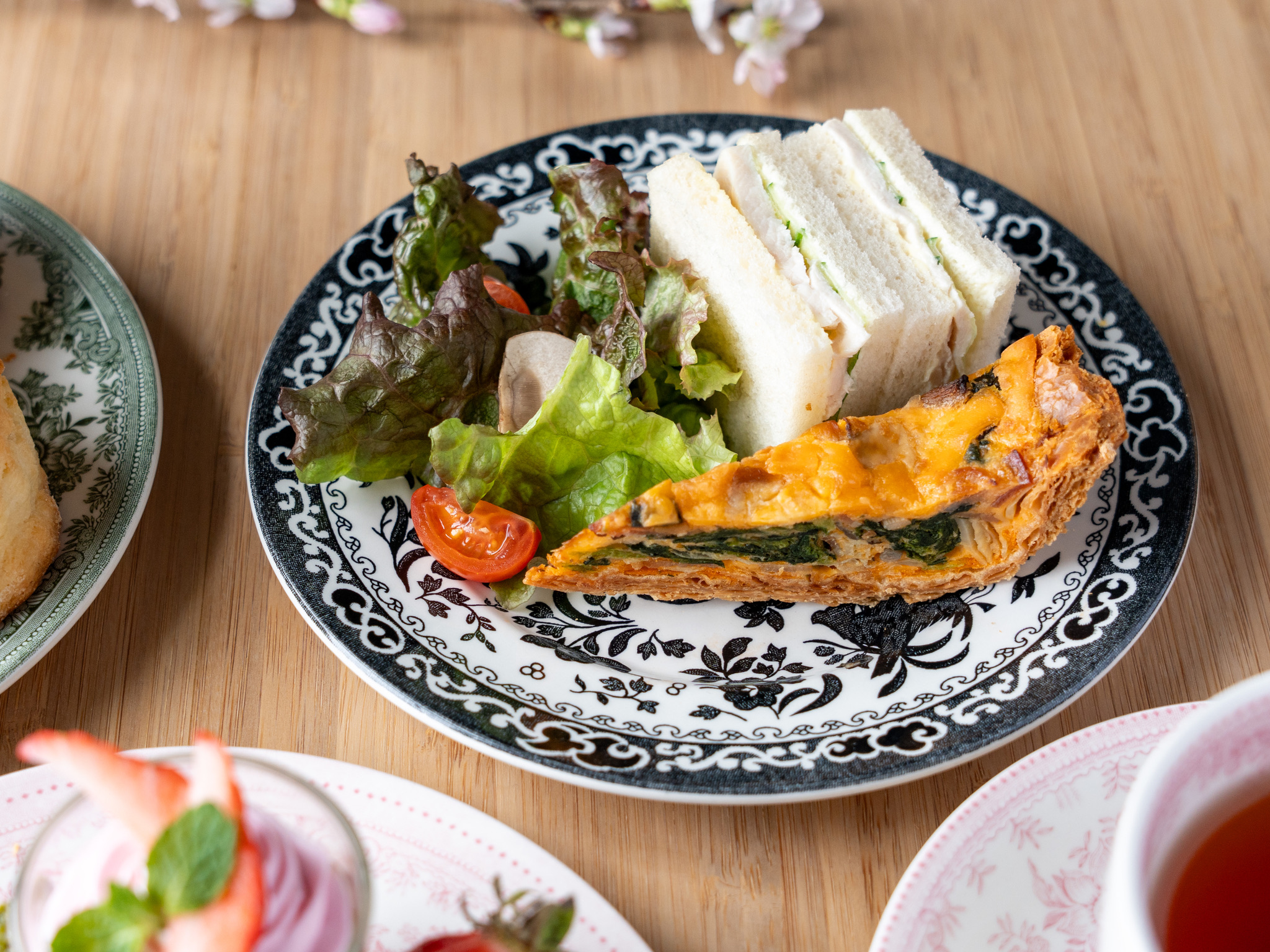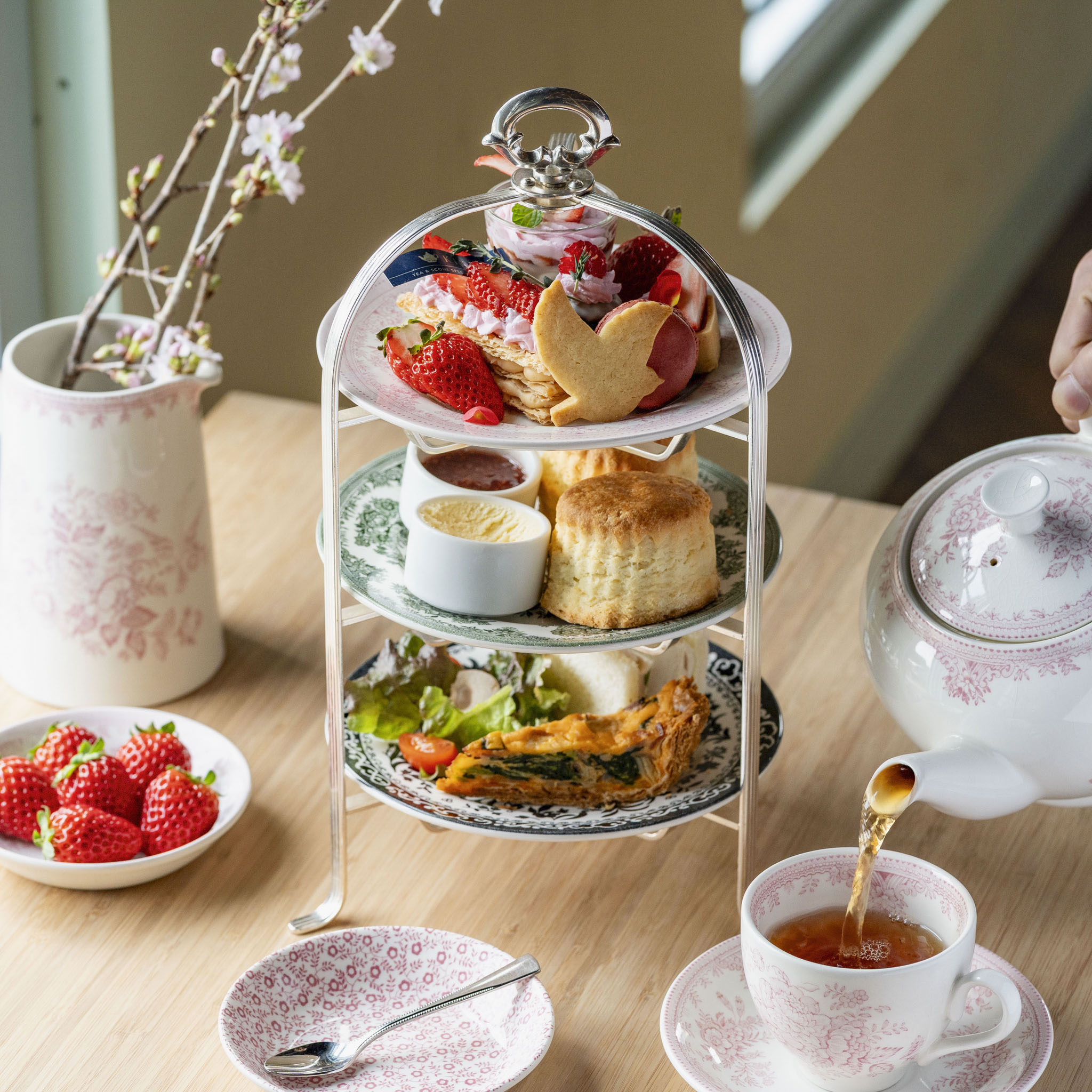 イギリス19世紀のデザイナー、ウィリアム・モリスは、別荘の菜園で小鳥が苺を啄む様子から、代表作「いちご泥棒」の着想を得たといわれています。本セットは、その作品をモチーフにした春季限定のアフタヌーンティーです。