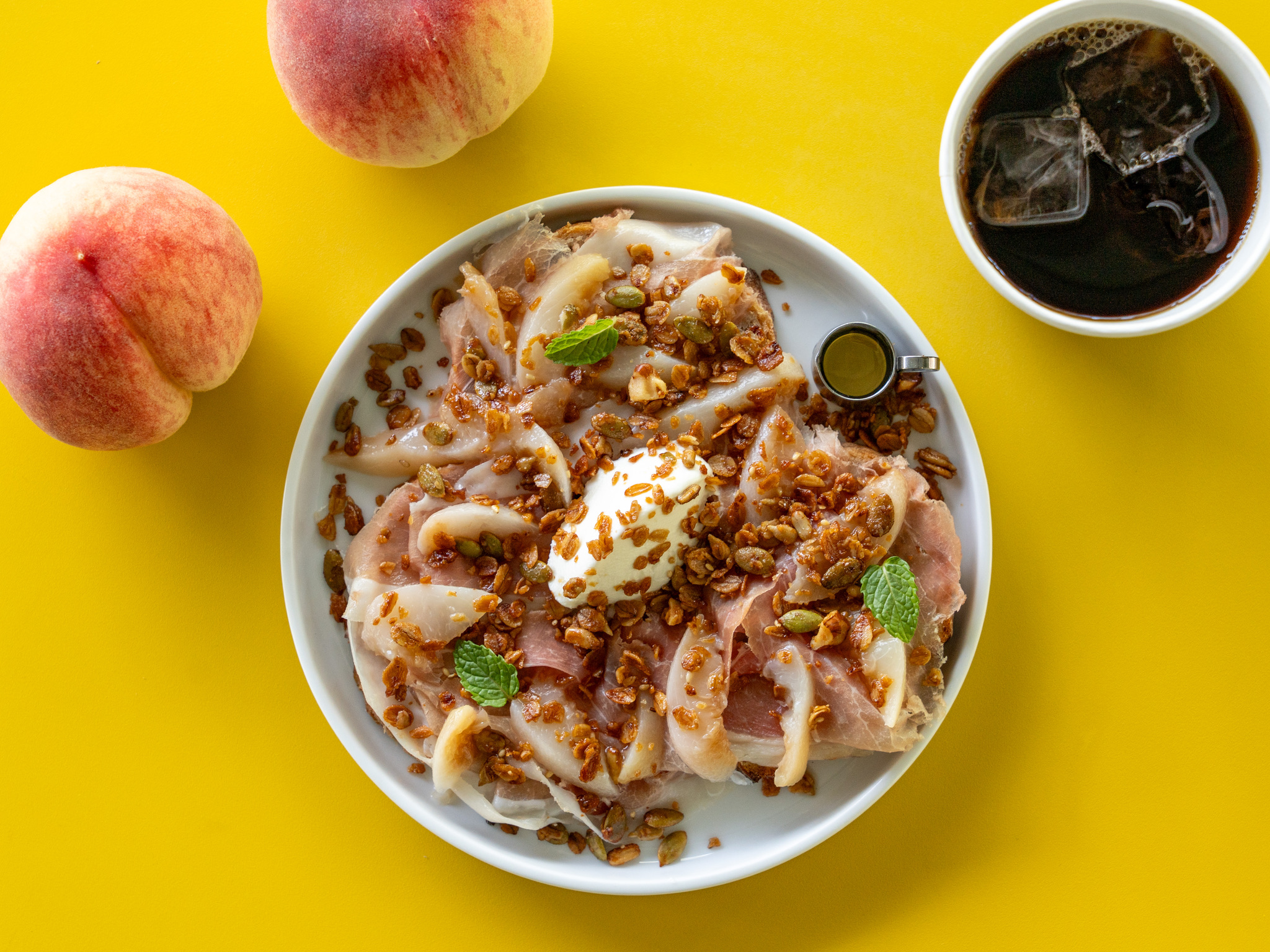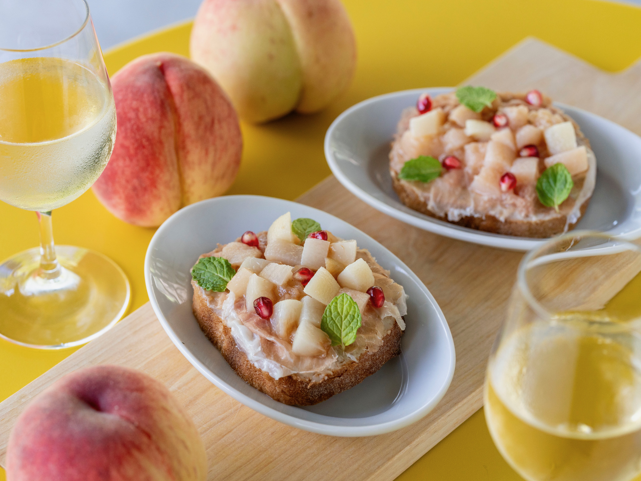 こんがり焼いた自家製カンパーニュに、胡桃とクリームチーズ、アガベシロップを合わせた特製クリームをたっぷりと。生ハムと桃を重ねて、甘じょっぱい大人のスイーツに仕上げました。