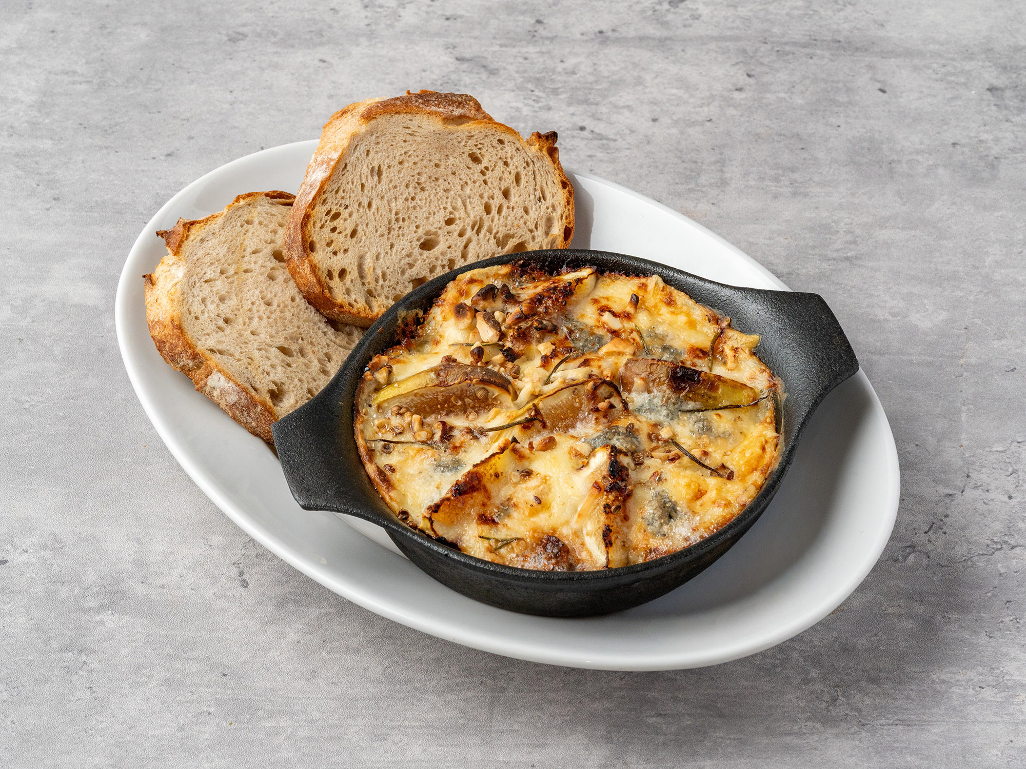 いちじくを青カビチーズのゴルゴンゾーラを合わせたグラタン。塩味と甘味が絶妙に絡み合う後引く味わいを、添えたカンパーニュにたっぷりのせてお楽しみください。
