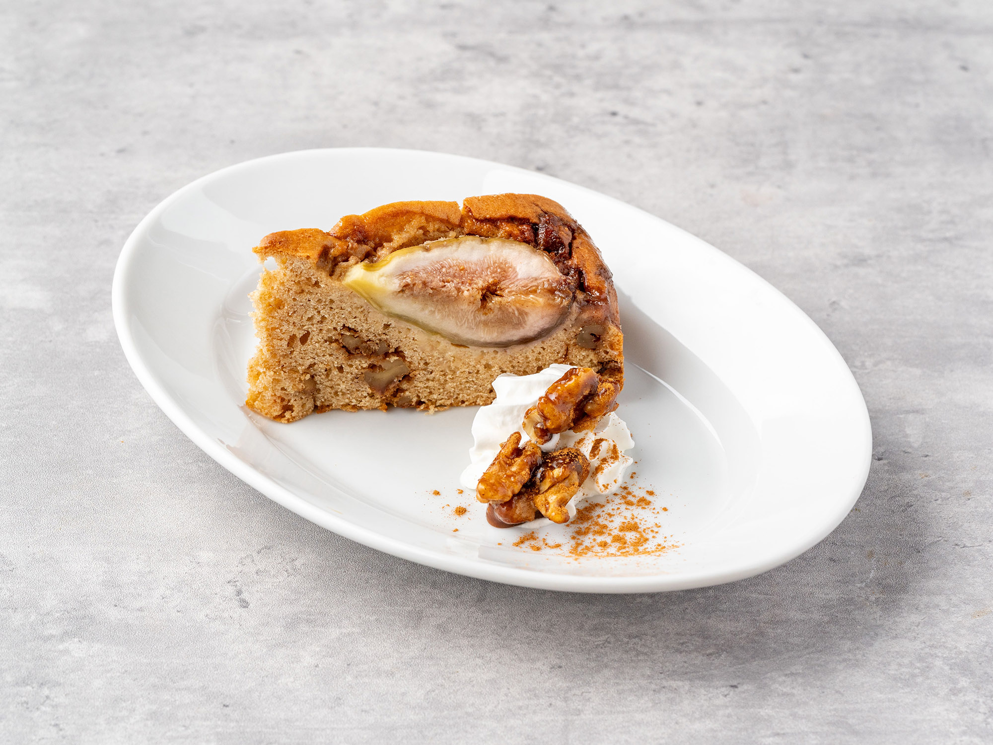 風味豊かな全粒粉がベースのパウンドケーキに、フレッシュのいちじくを乗せて焼き上げました。アクセントにキャラメルでコーティングしたくるみを混ぜ込んでいます。