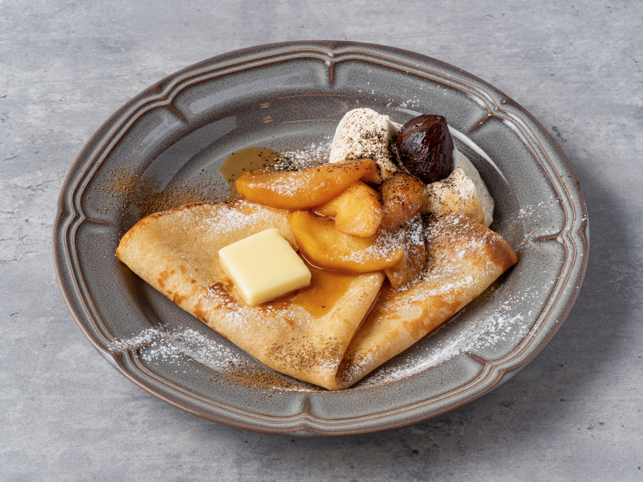 ほろ苦く煮た青森県木村りんご園のりんごと、和栗のクリームをたっぷりと乗せました。ほうじ茶の香りがより一層冬を感じさせるクレープです。