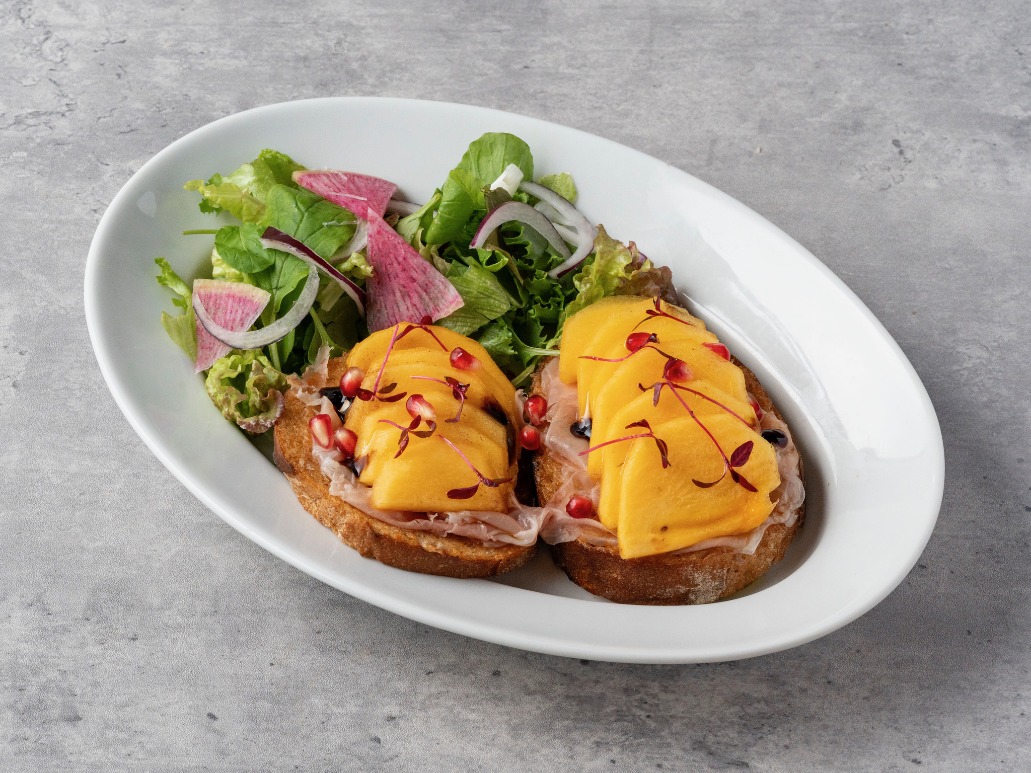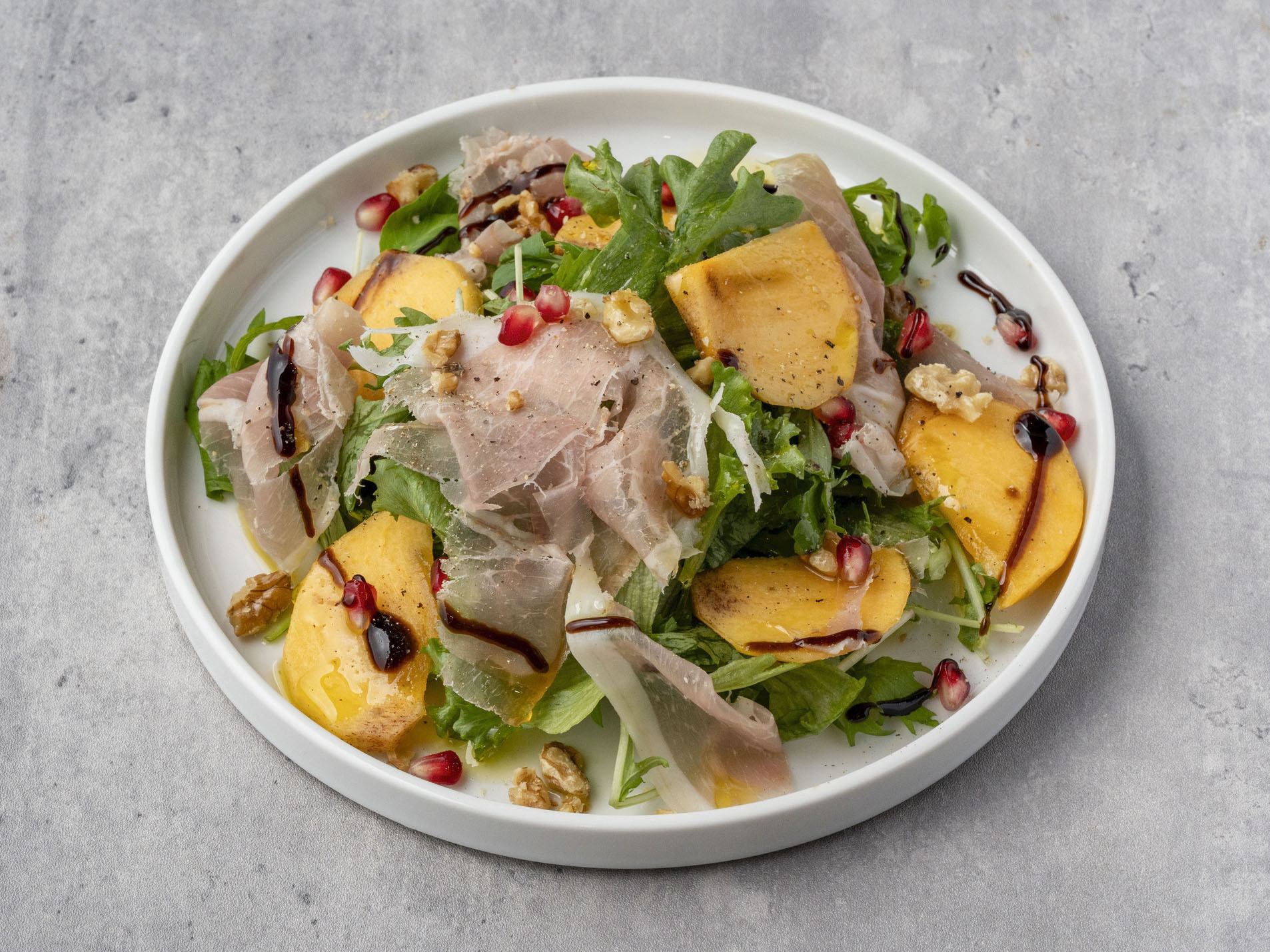 甘い柿と生ハムの塩気が好相性。ザクロとくるみのアクセントと食感を添える、爽やかなサラダです。