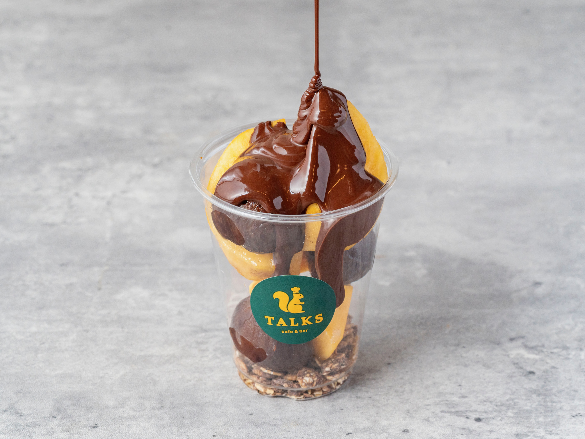 旬のシャインマスカットの上から、カカオ70%のTALKSオリジナルチョコレートをたっぷりかけたシンプルで贅沢なデザート。チョコグラノーラがアクセントです。【Vegan】
