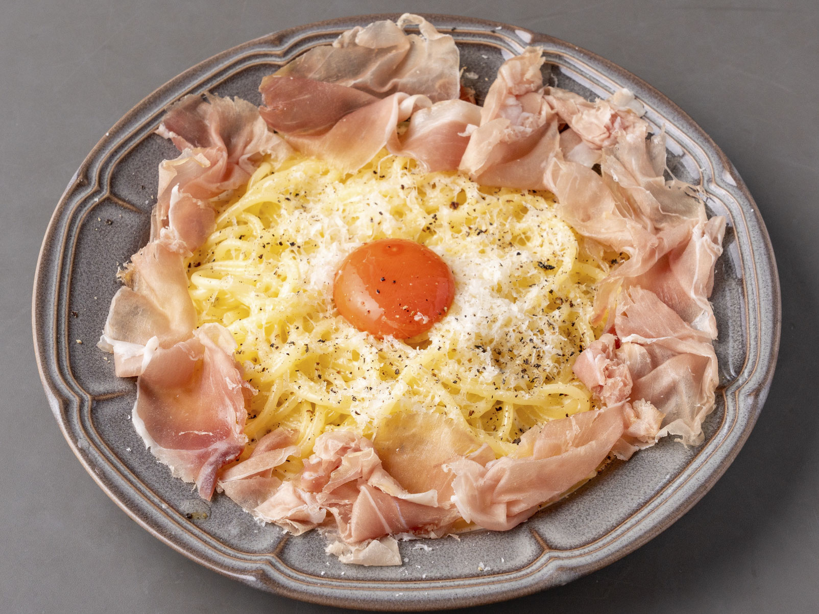 ・削りたて生ハムと蘭王たまごのカルボナーラ
