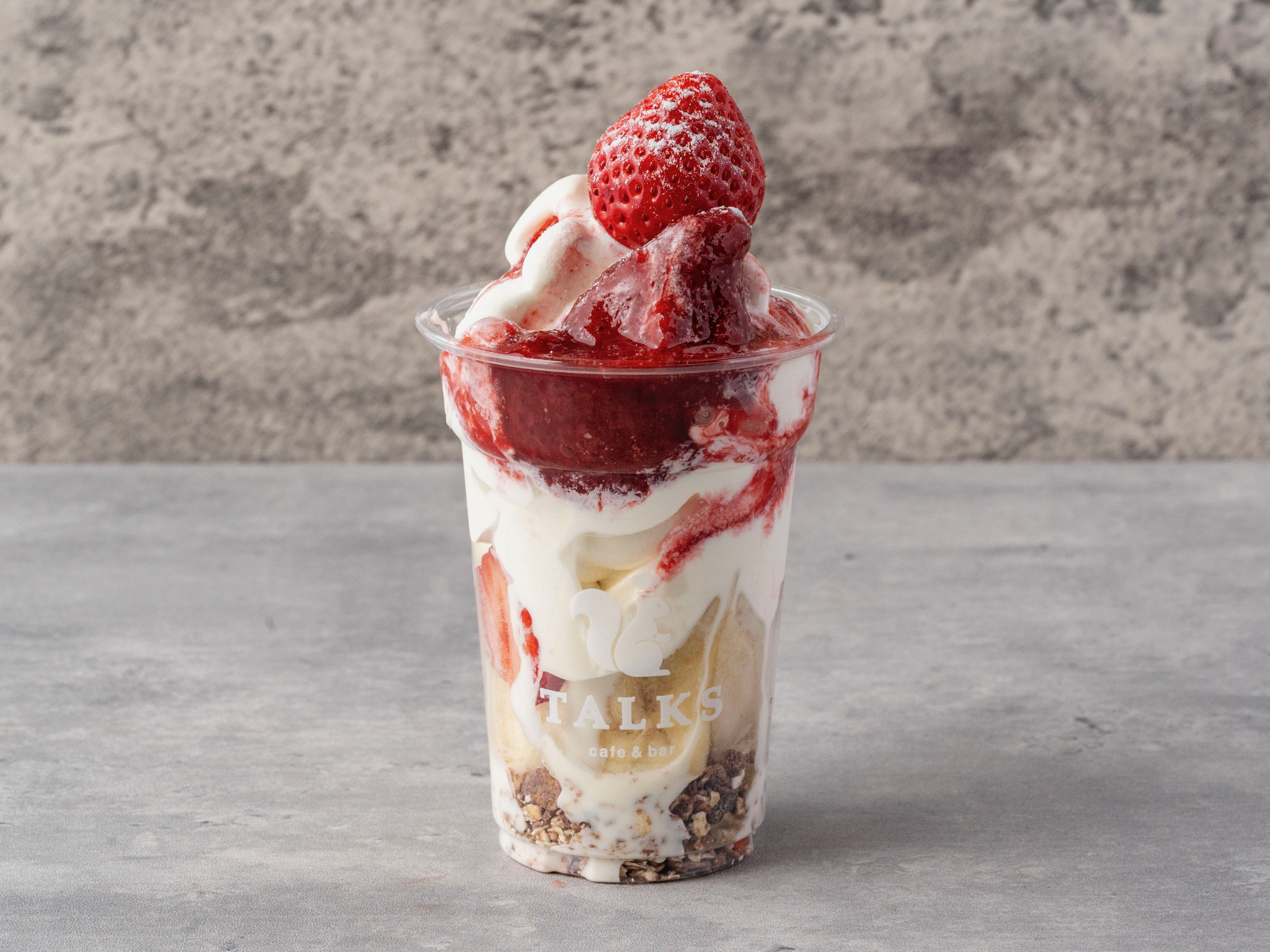 豆乳ヨーグルトに、カカオ70%のTALKSオリジナルチョコレートで作ったチョコグラノーラを使用。いちごとバナナを贅沢にトッピングしました。【Vegan】