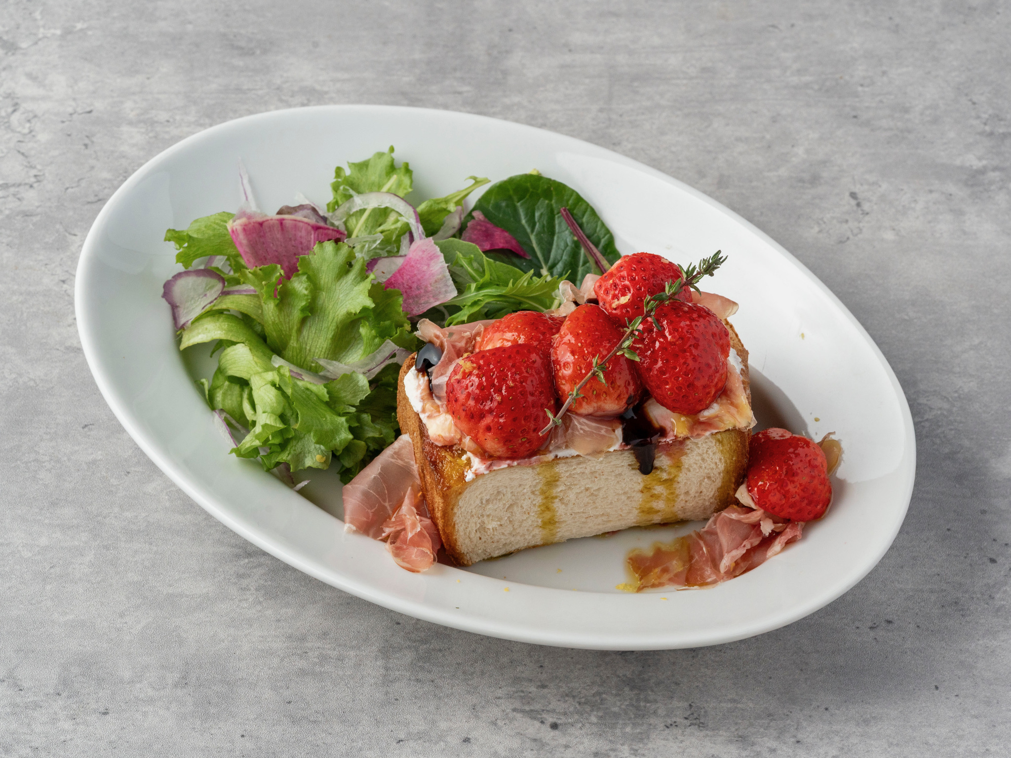 ビネガーでマリネしたいちごを、マスカルポーネチーズと生ハムとともにふんだんにのせました。ジューシーで甘酸っぱいいちごと、生ハムのほどよい塩気がくせになるオープンサンドです。