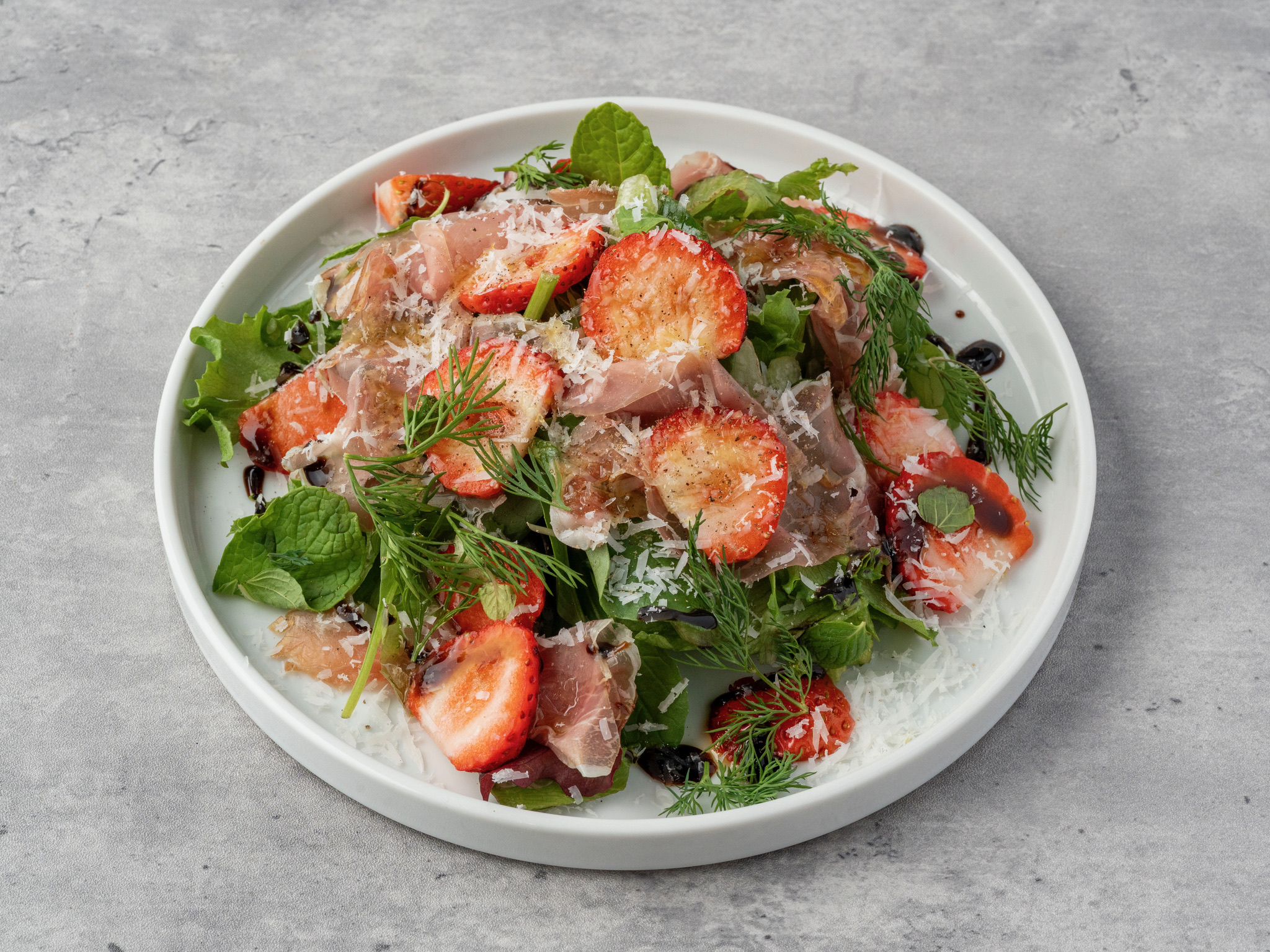 いちごと生ハムに、ペコリーノチーズをたっぷりとかけ、シーザーサラダに仕上げました。
